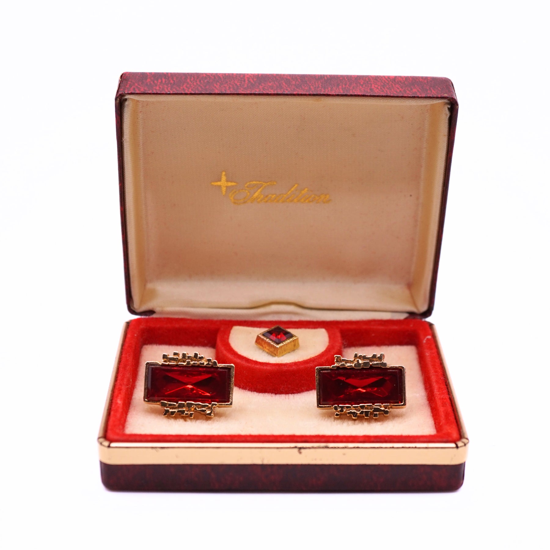 Featuring striking rectangular ruby-red crystals framed in ornate gold-toned settings. Matching tie tack completes the elegant mid-century look.