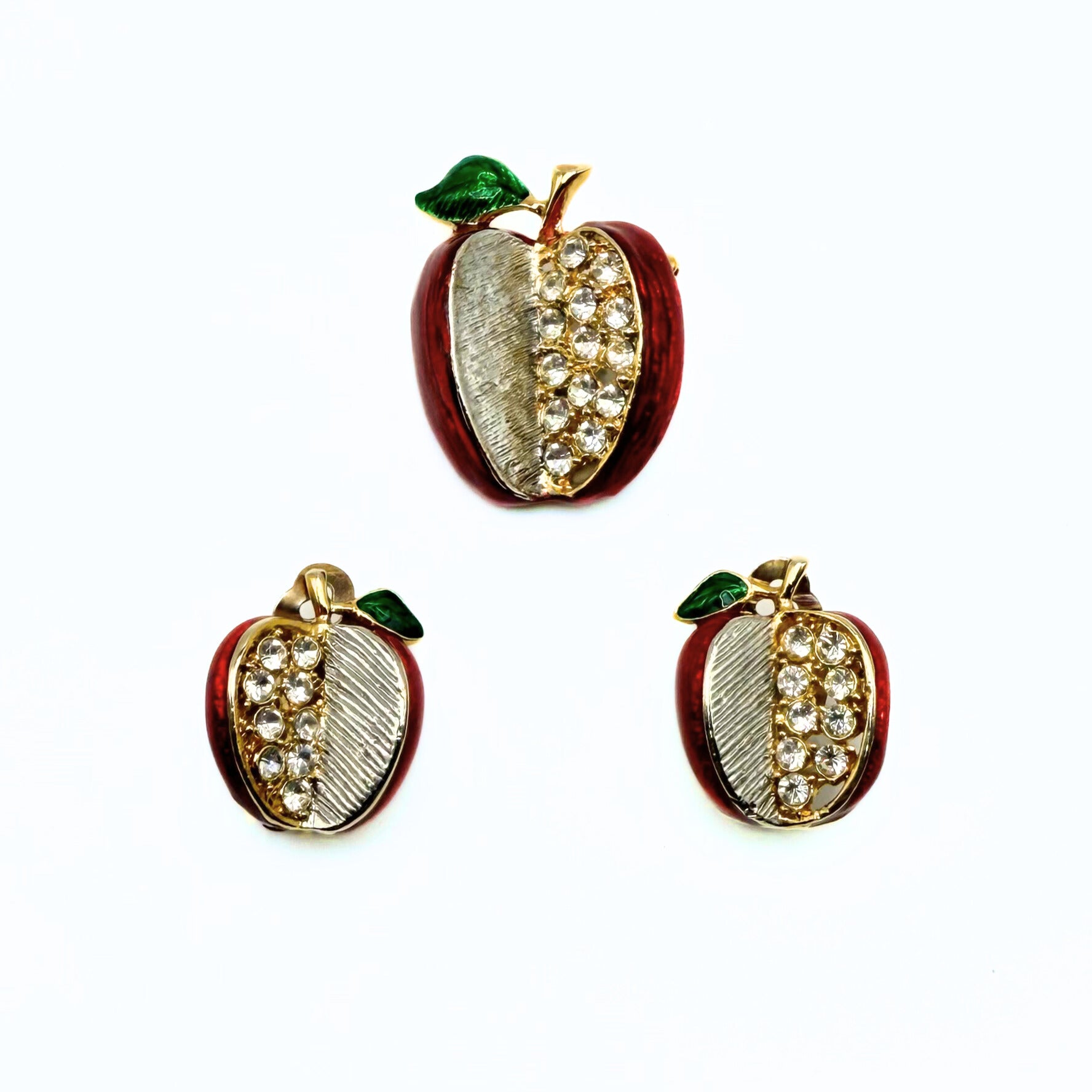 Beautiful vintage unsigned apple brooch and matching clip-on earrings, richly enameled in red with hand-painted green leaf accents and clear rhinestones.
