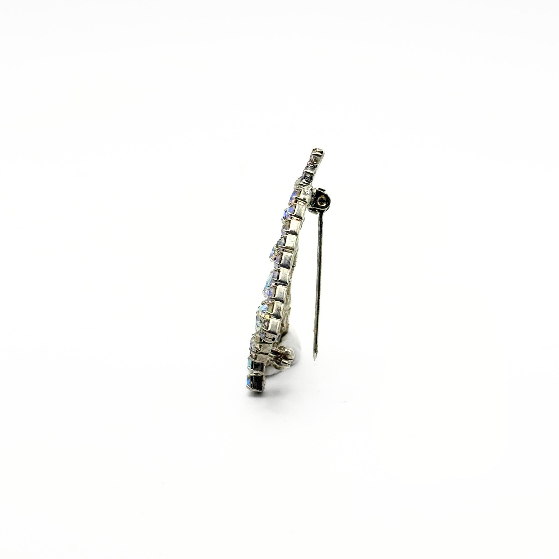 Beautiful vintage rhinestone Christmas tree brooch featuring shimmering aurora borealis stones in a silver-tone openwork design.