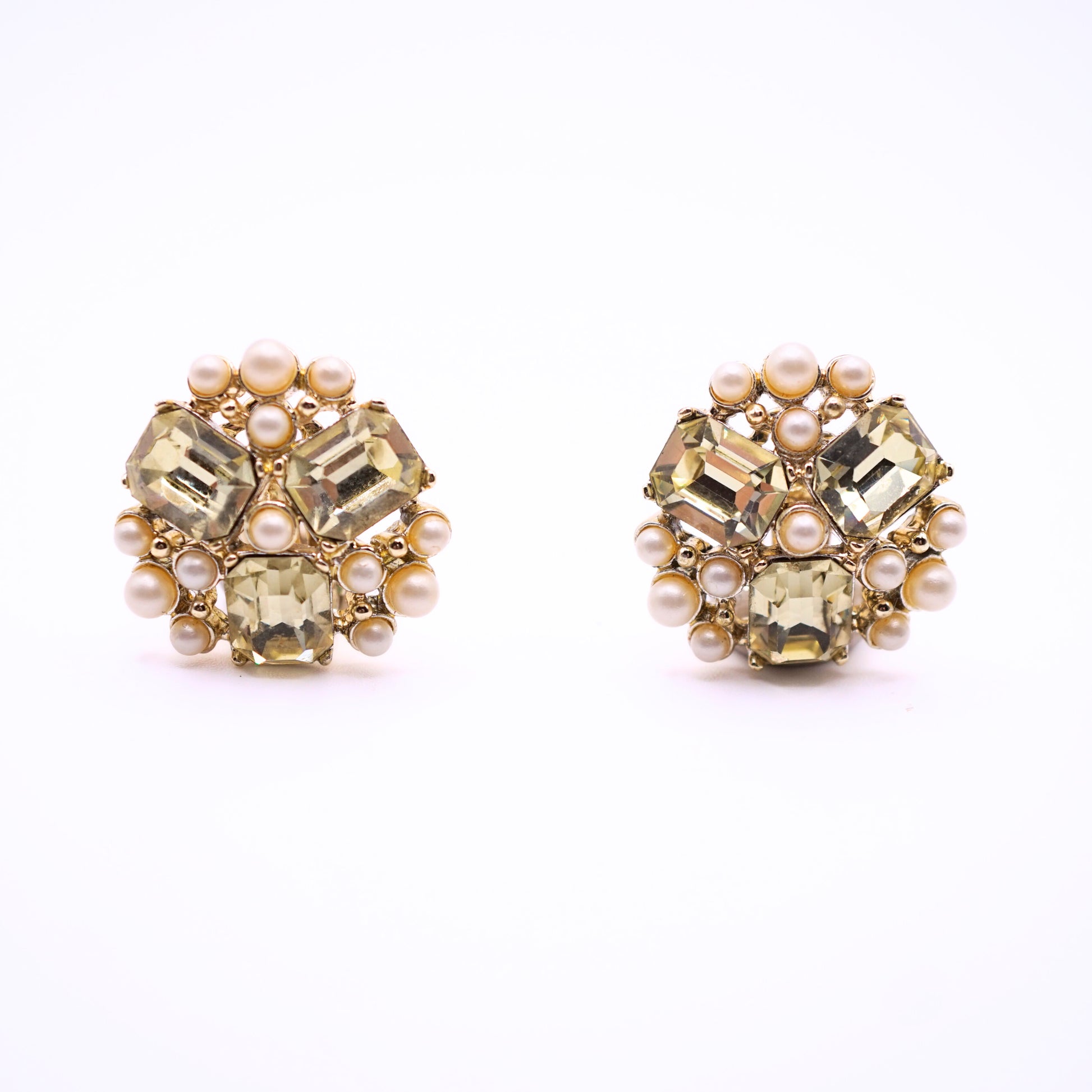 - Materials: Bakelite, Cut Rhinestones, Faux Pearls, Gold Tone Metal