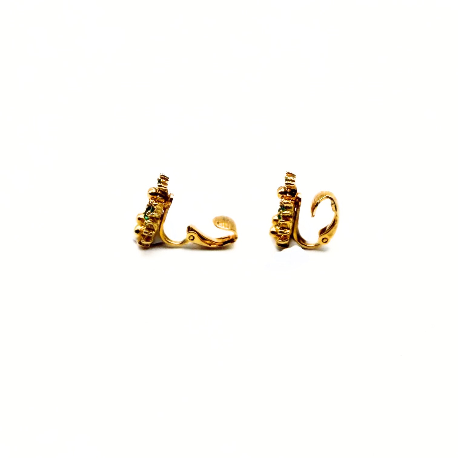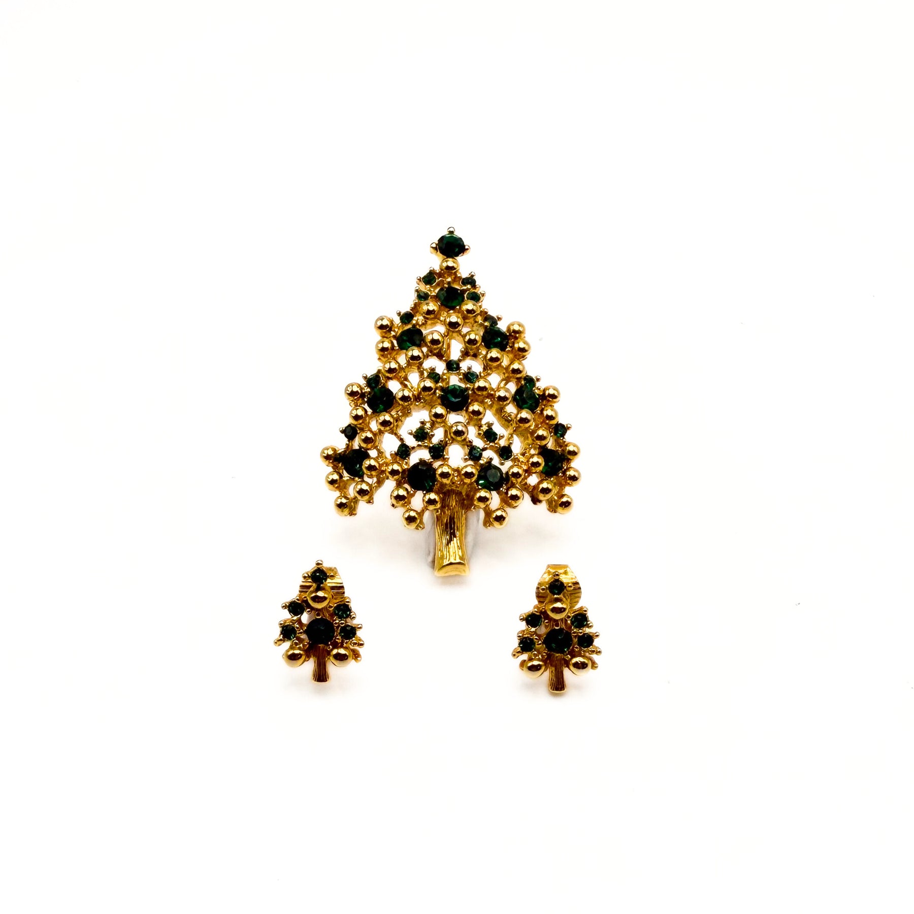 Beautiful vintage set signed by Eisenberg Ice, maker of glamorous mid-century jewelry. Gold-tone Christmas tree brooch with matching clip-on earrings set with radiant green rhinestones.