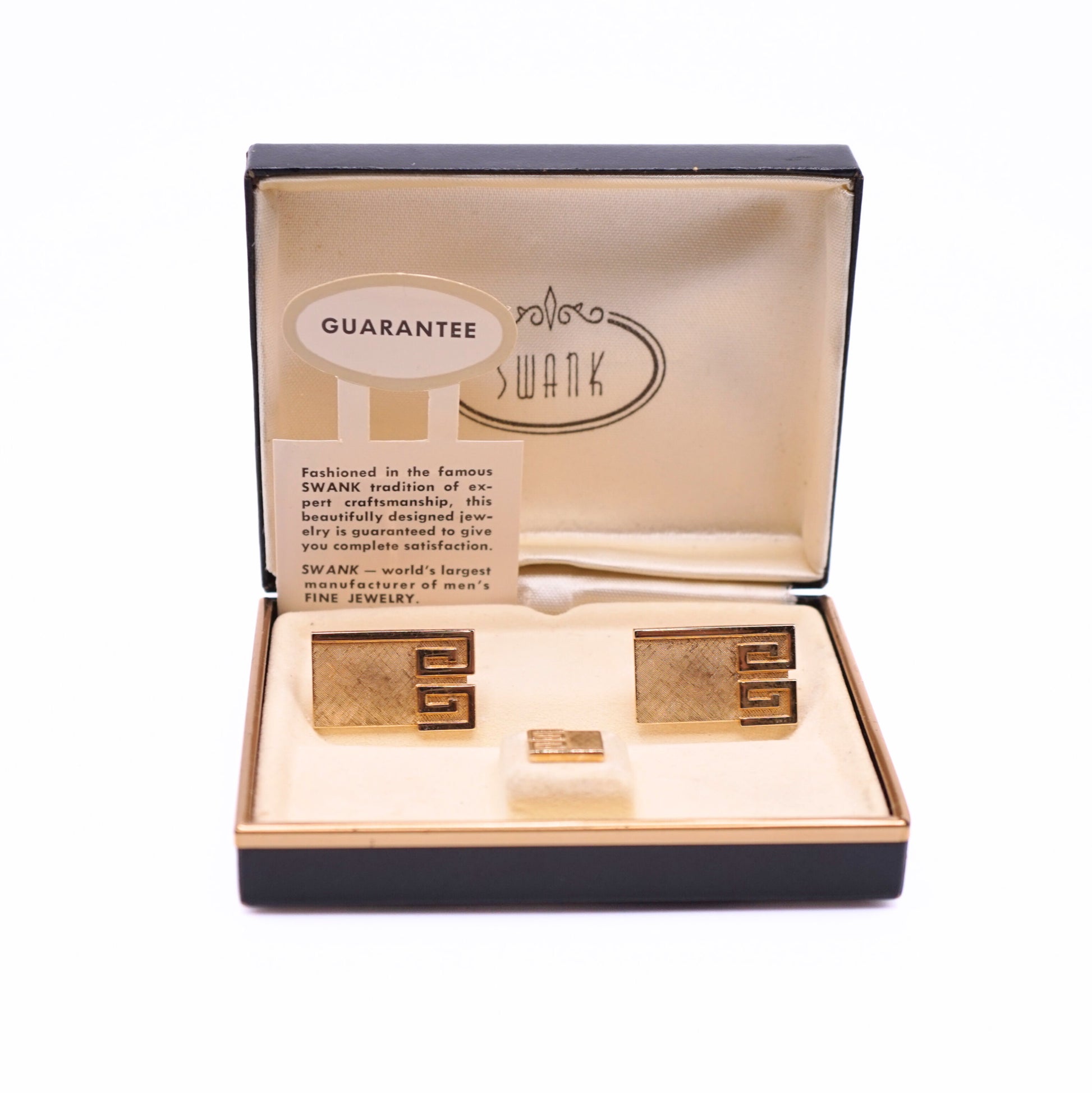 Beautiful vintage Swank cufflinks and tie tack set in sleek gold-tone metal with modernist Greek key inspired design. Presented in original Swank box with guarantee card.