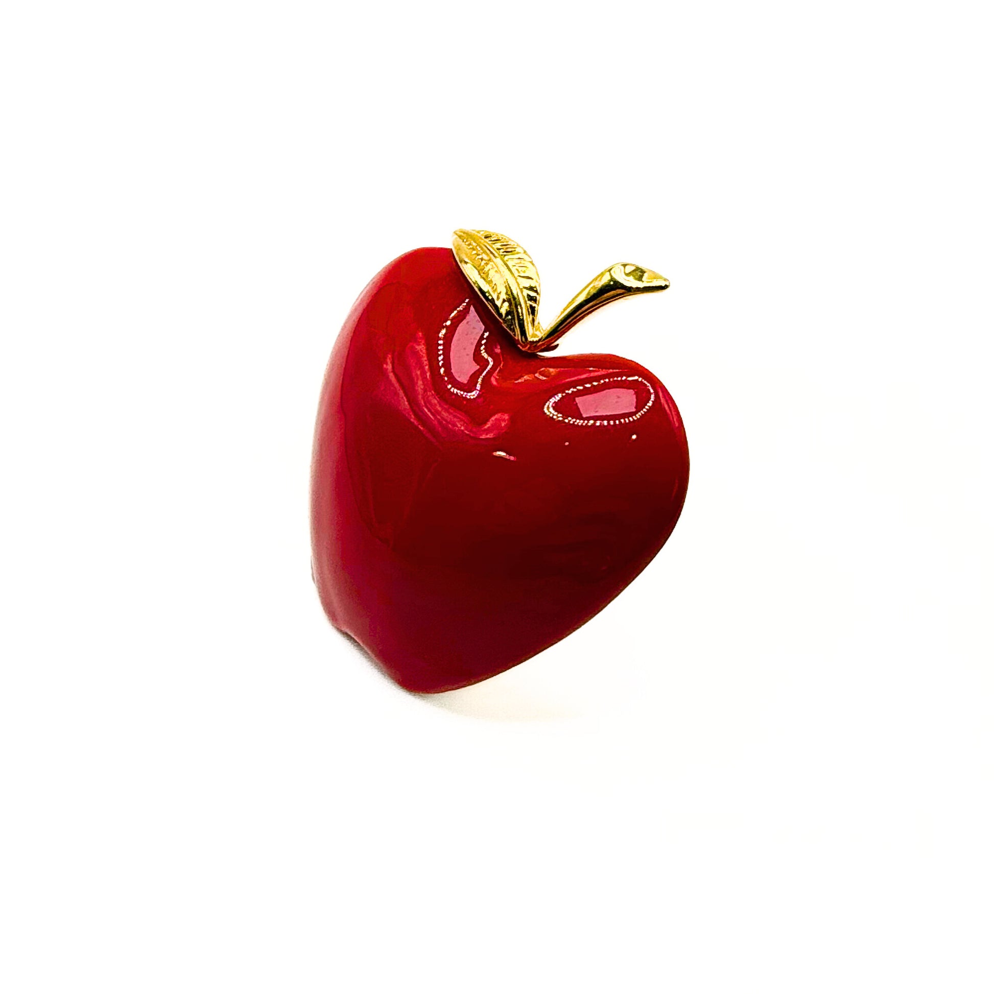 Beautiful vintage unsigned apple brooch featuring bold red enamel with a sculpted gold-tone stem and leaf for a cheerful mid-century accent.