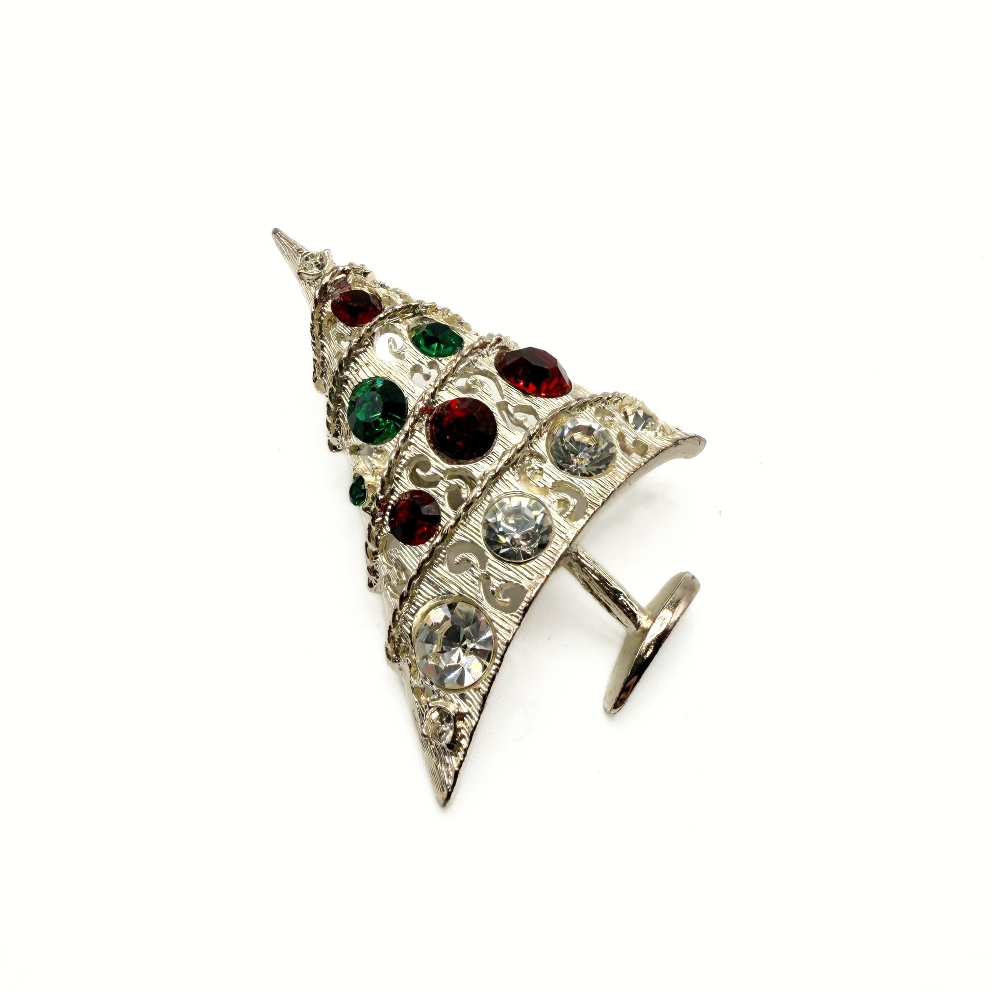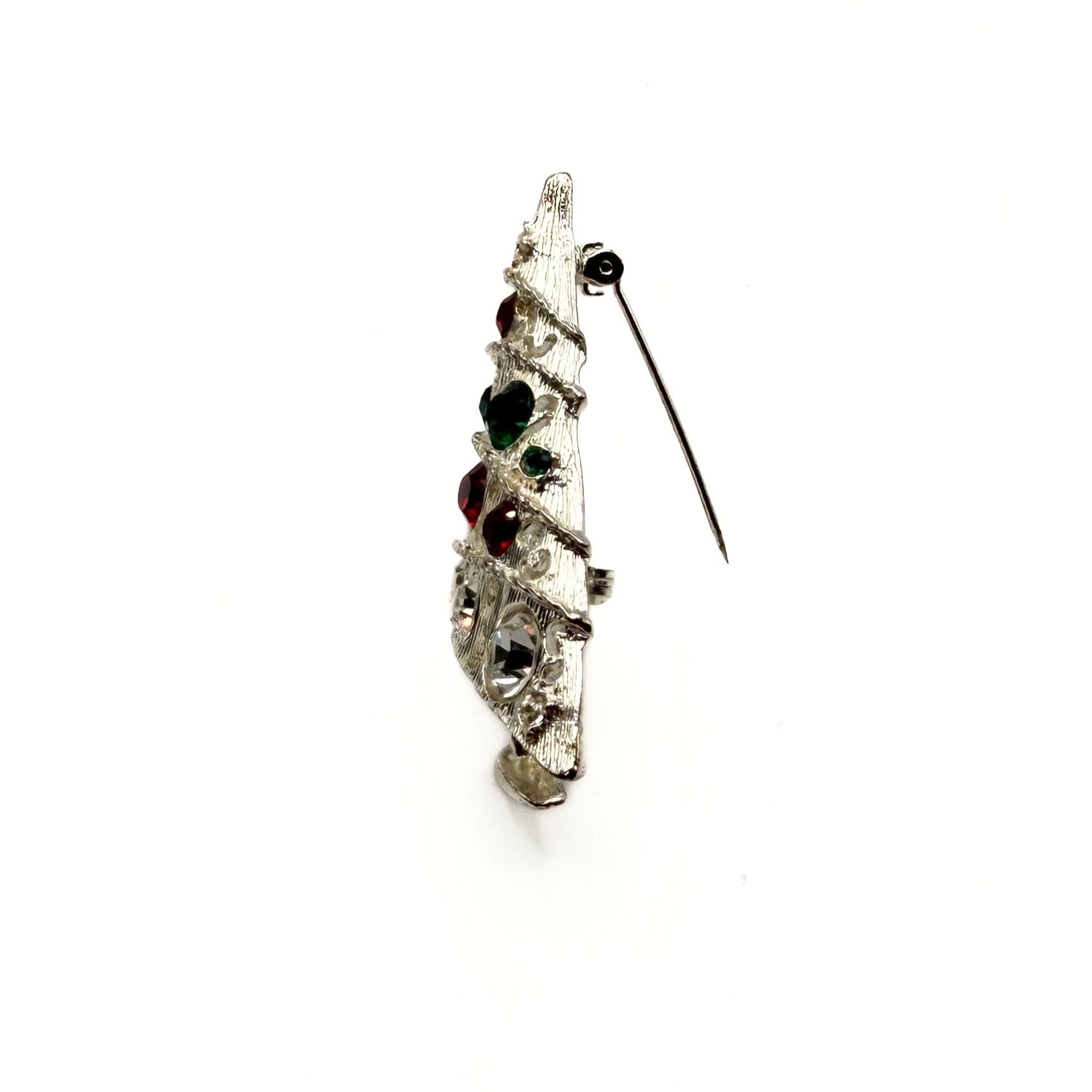 Vintage Red, Green & Clear Rhinestone Christmas Tree Brooch