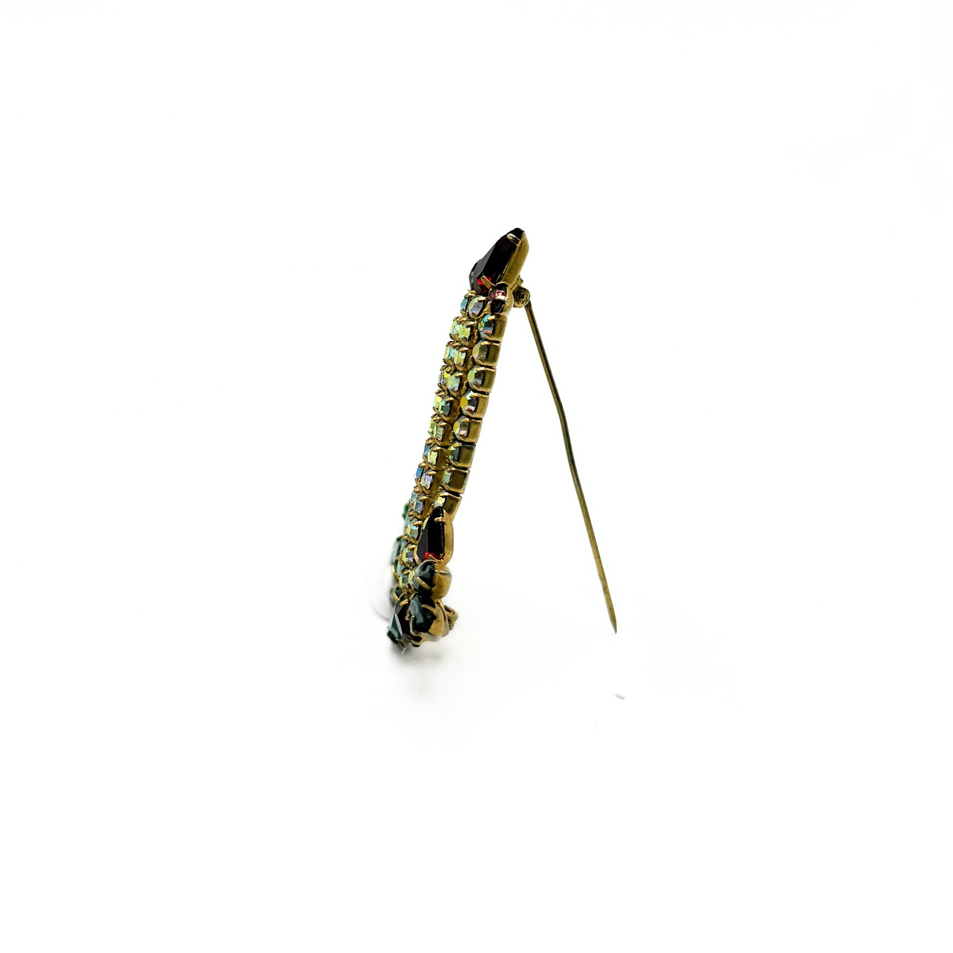 Vintage rhinestone candle brooch with aurora borealis stones, red teardrop flame, and green marquise holly leaves.