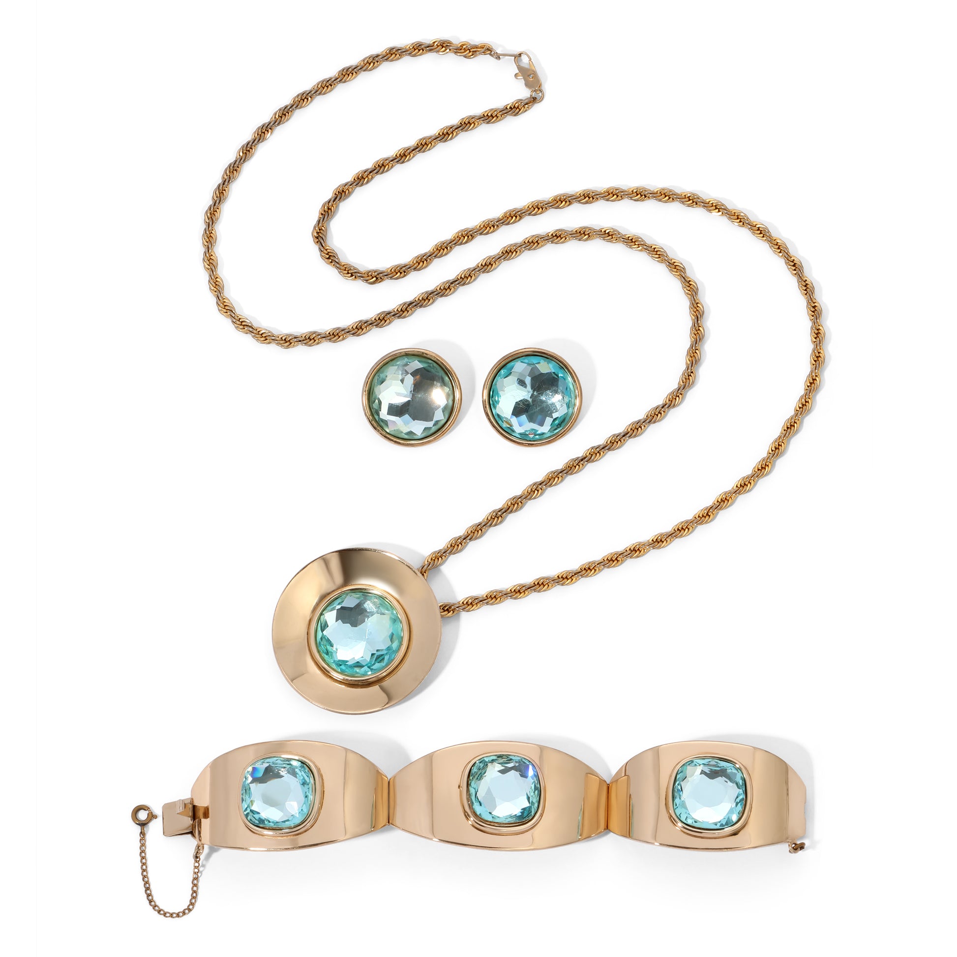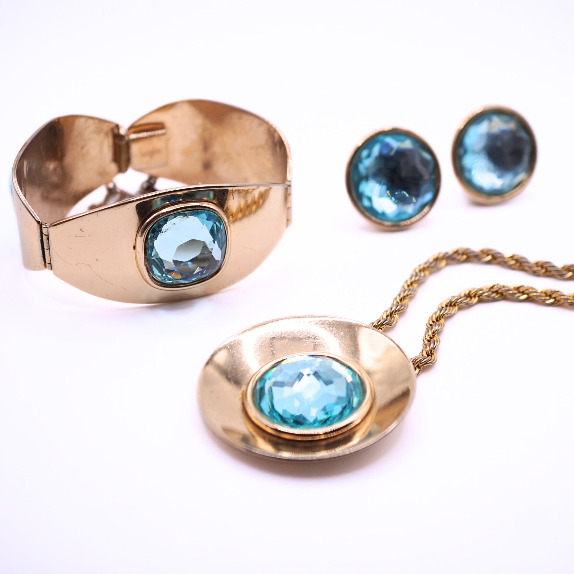 Vintage Signed Bergere Aqua Blue Glass Facet Parure