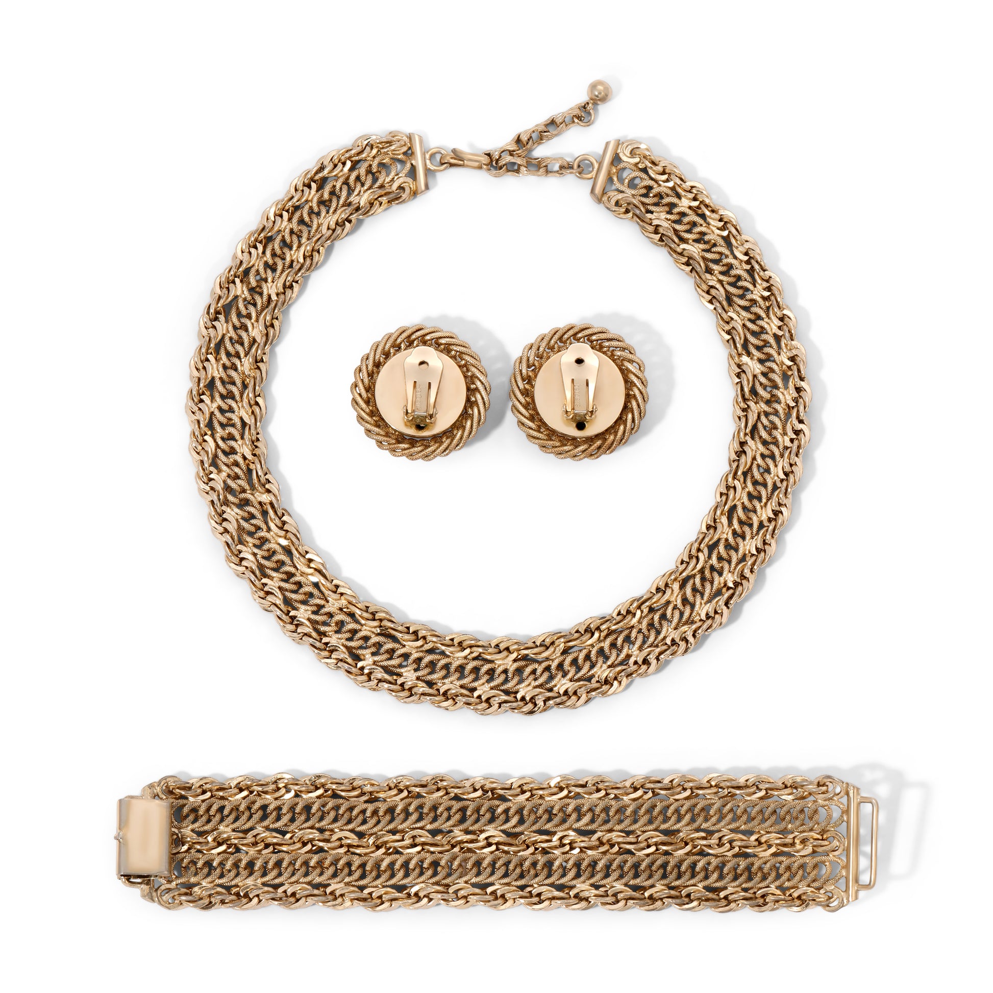 Beautiful Gold Vintage Set includes Matching Necklace, Bracelet, and Clip-on Earrings. Earrings and Bracelet signed Bergère.