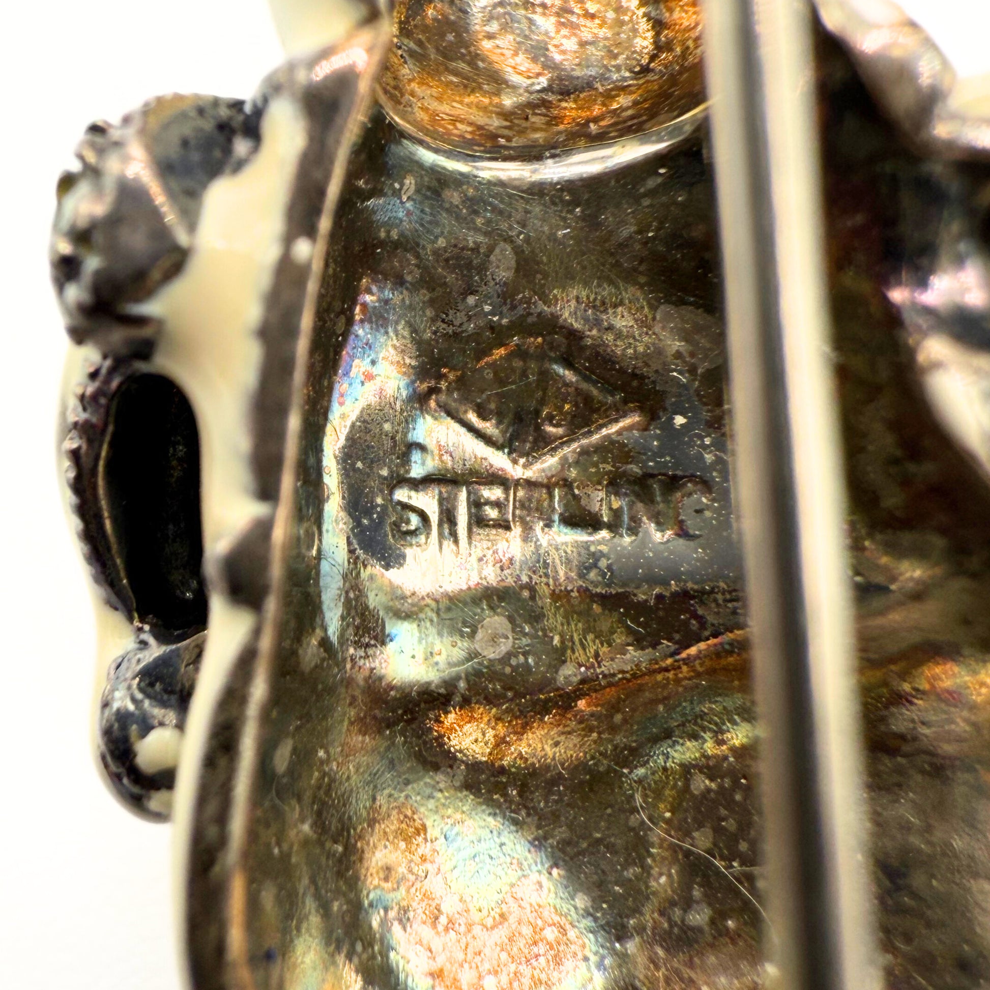 Vintage sterling silver snowman brooch with enamel accents, rhinestone buttons, and shovel detail.