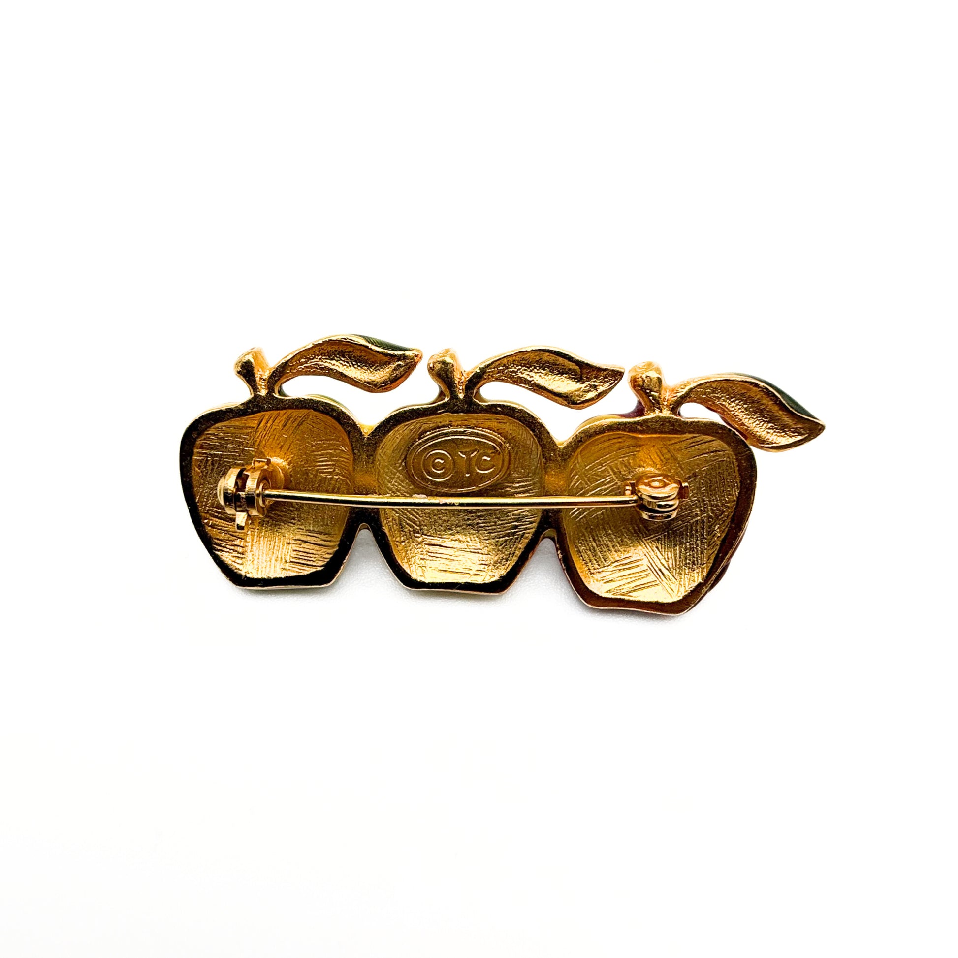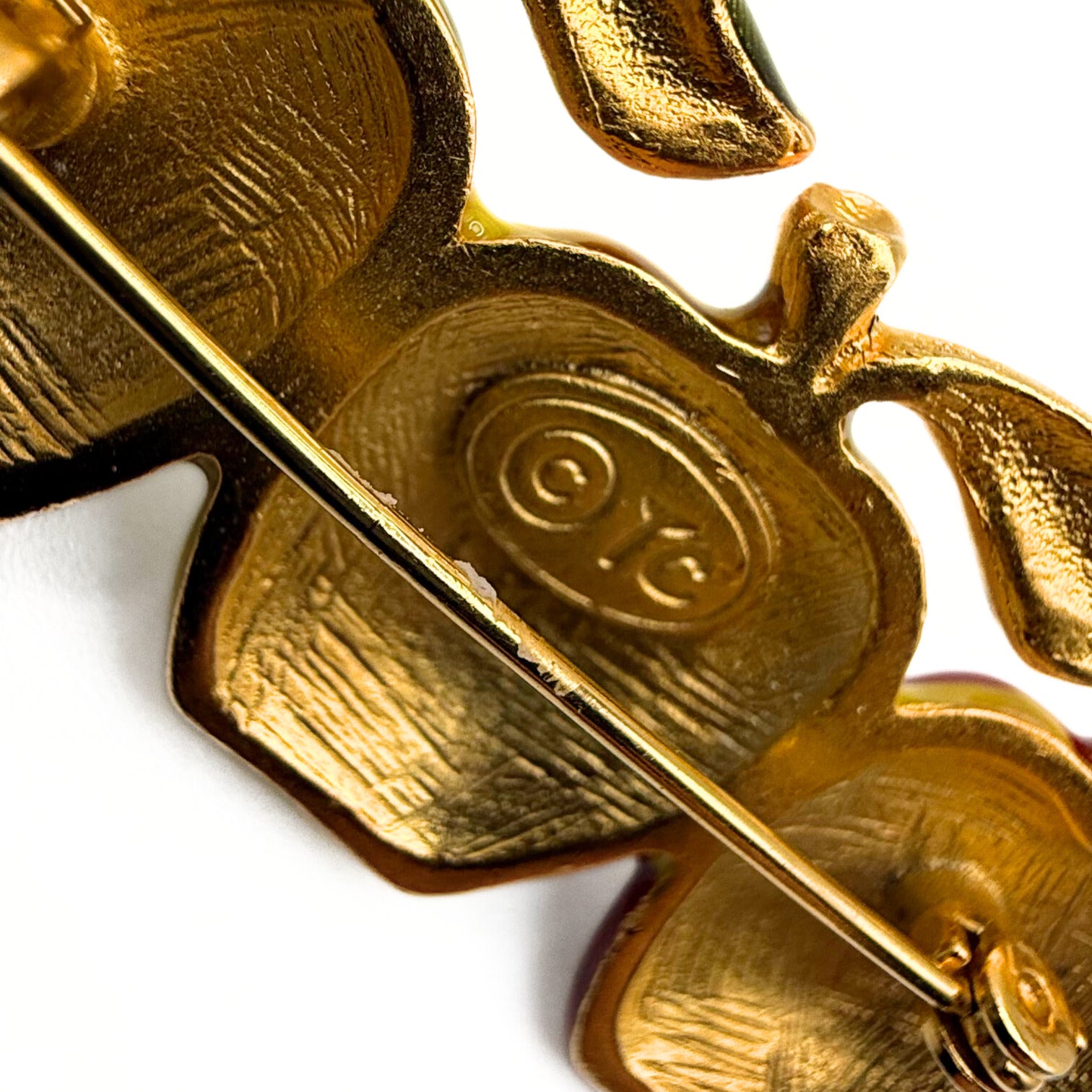 Beautiful vintage signed Tanya Creations brooch with enamel detailing in shades of red, yellow, and green on a warm gold-tone base.