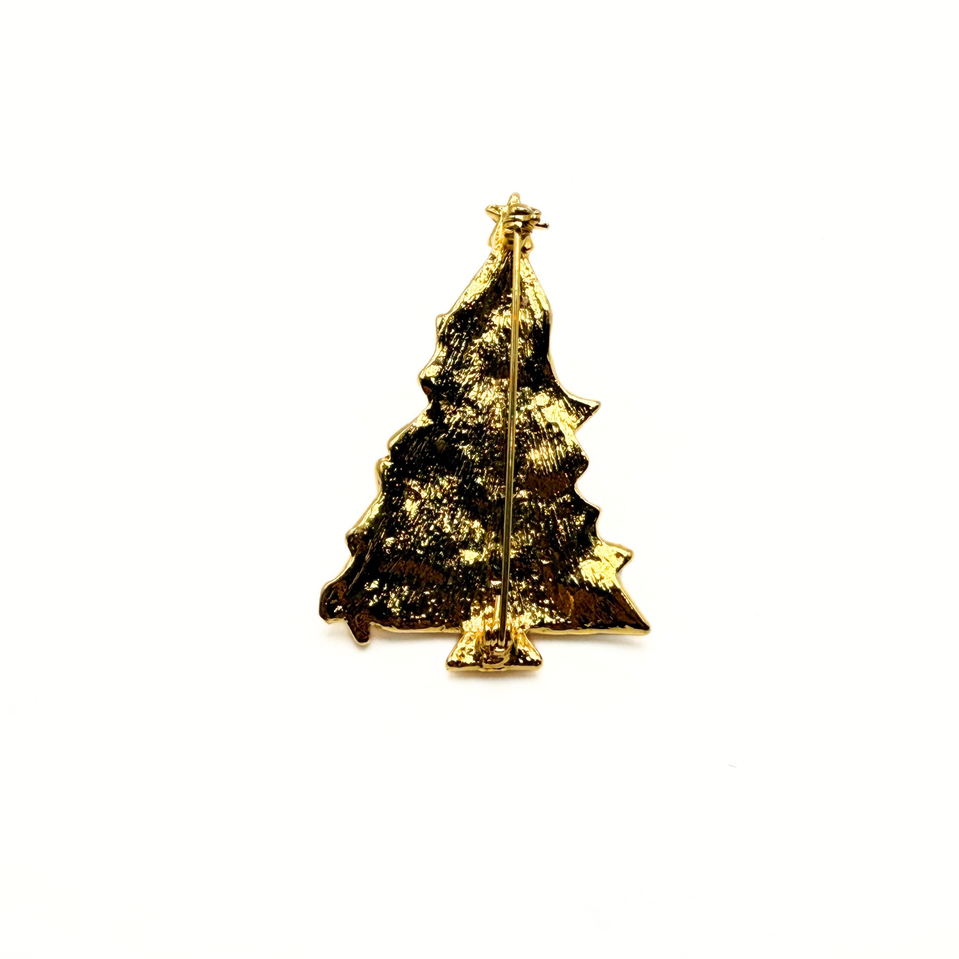 Beautiful vintage unsigned brooch featuring a white enamel Christmas tree accented with red rhinestone ornaments and gold-tone garland detailing — a charming mid-century holiday piece with timeless appeal.